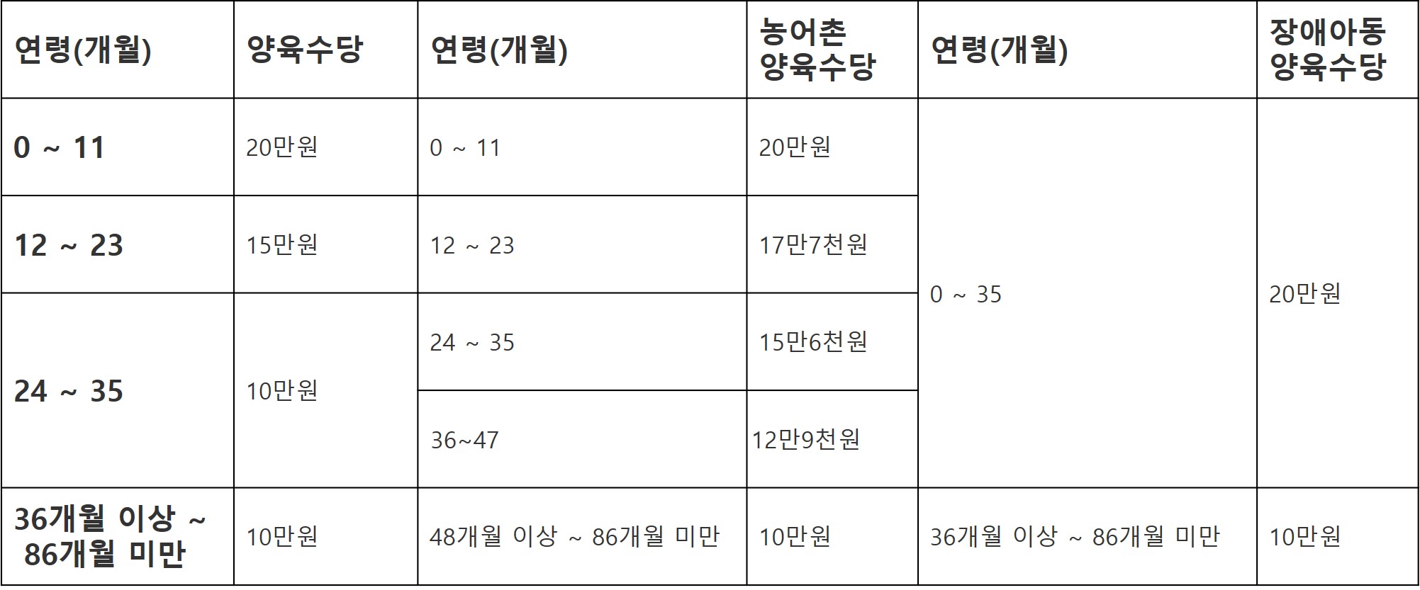 -자녀의 연령에 따라 월 10만~20만 원의 정액을 아래와 같이 제공합니다